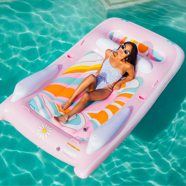 Somewhere over the rainbow (in the pool) waters are blue! This rainbow float is great for catching some rays and floating in style.